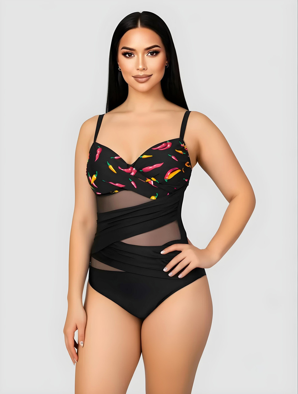 Ефектний суцільний купальник зі вставками з еластичної сіточки з гарною формою ліфа. Спеціально розташовані вставки із сітки відвертають увагу від проблемних місць.